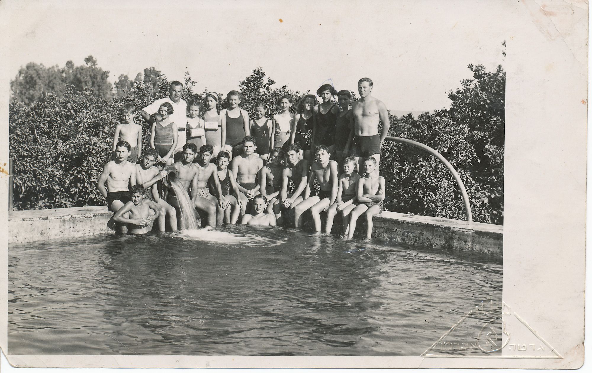 הבריכה של רוסינוב בפתח תקוה, חודש אב תרצ"ח. המורים לשחיה בורשטיין אקרמן גרטה