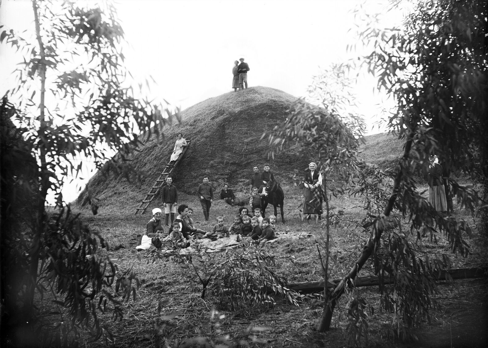 בתמונה הממוסגרת על ידי שני עצי אקליפטוס מימין ומשמאל ומצולמת מול ערמת התבואה בגורן, נראים 23 מחברי קבוצת גבע, רובם ילדים וגננות היושבים על שמיכת בד. סביבם יש חברי קבוצה נוספים, חלקם מבוגרים הלבושים בבגדים שנראים כבגדי חג. על הפרדה רוכב הנער אברהם זרחי, אישה אחת לא ידועה עומדת על סולם הנשען על הערמה, וזוג חברים – צבי רוטברט ואסתר מצליח – עומדים על ראש ערמת התבואה. התצלום המבוים אפשר לצלם, שעבד בהזמנת הקרן הקיימת לישראל, להראות את הצד האסתטי של עבודת האדמה הקשה באותה תקופה ולהציג תמונה הרמונית ואידילית של המציאות. זהו צילום חורף שצולם לפני כמאה שנים, ומסמן את חיבור "האדם החדש" אל ערש הטבע של ארץ בראשית. ענפי האקליפטוס מהווים מעין כתר קיבוצי לראשם של הילדים־מלאכים, והסולם מתכתב עם מורשת הצילום העולמית, כפי שאפשר לראות בתצלום The Haystack (1844) של הצלם האנגלי הנרי פוקס טלבוט (Talbot), שבו מושען סולם על ערמת חציר, ומתצלומיו של "סולם הסטאטוס קוו" – הסולם שאי אפשר להזיזו ממקומו, היורד מחלון כנסיית הקבר בעיר העתיקה בירושלים – מאמצע המאה ה־19. בפענוח שנעשה במהלך השנים בארכיון גבע אותרו ונרשמו שמותיהם של מרבית המצולמים, ואפשר לאתרם לפי המקרא המופיע ב־PDF במקורות ערך זה.
