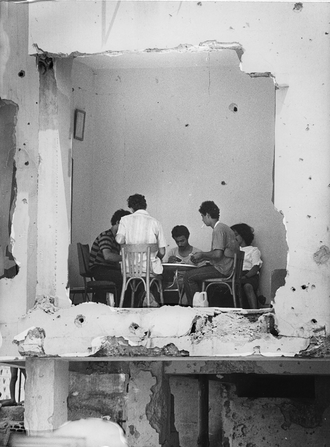 צעירים לבנוניים משחקים קלפים בבית הרוס במלחמת שלום הגליל, באחת העיירות סמוך לביירות