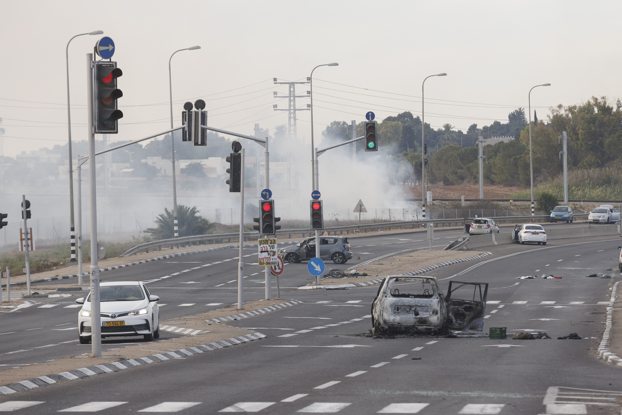 רכבים שרופים על כביש 34 232 לאחר התקפת מחבלי חמאס על יישובי הדרום ב- 7 באוקטובר