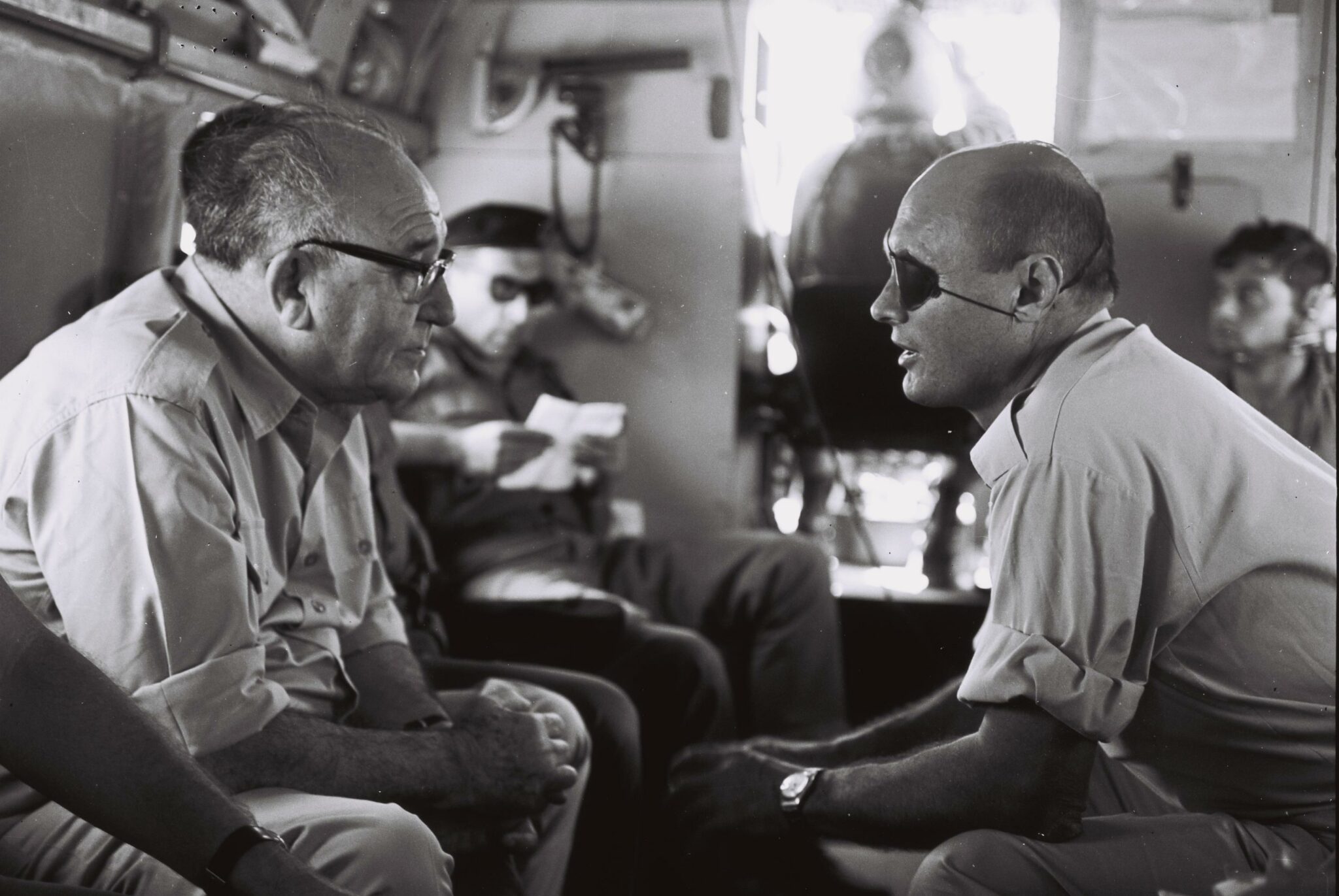 שיחה בין ראש הממשלה לוי אשכול לשר הביטחון משה דיין (מימין), בזמן טיסתם במסוק לסיור במתקני צה"ל בגדה המערבית ברונר אילן